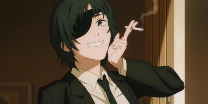 it's a pretty show, too. It handles the CG a lot better than i expected and i love how all of the action scenes flow super well, though the character designs are my favourite part of it. it has what might be the best designed cast of any of the major recent shonen. makima looks perfect, i love power's design and her cool looking powers, the angel devil is literally perfect and probably my favourite of the designs, himeno looks great, even more lowkey characters like kobeni, aki and Kusakabe all look great, plus i mean, pochietta is amazing. who can hate that little guy? for all my issues with him even denji looks rad with his shark teeth and the admittedly really rad chainsaw form. the characters are great even beyond their designs. i'd even say of the most recent wave of shonen shows it has one of the best casts of any of them. makima is, a lot, but i love her even with all of the moral issues that come with that. I can forgive a lot and i will make excuses for anything she does, even god cannot stop me. the angel devil too, is great. he doesn't get much screentime here beyond sharing a really cute scene with aki but the scenes he's in are great and he *shines* as being the best part of the reze arc movie, which i'll talk about another time. power too is a lot of fun. her VA's in English and Japanese both give her an amazing energy and i love her blood weapons a lot. she has probably the show's best fight scene with the training scene later on with Kusakabe, too. kobeni is another highlight, just a total wreck and i like her as an almost audience surrogate to how anyone would actually be in this world, every scene with her is just really funny and a little heartbreaking. aki too is great, though he takes a little bit to grow on you, his relationship with himeno is really cute too. i love himeno a lot too, another favourite character of mine who just has so many great scenes and i love her role in both the series best arcs and i just enjoy how much of a mess she is.