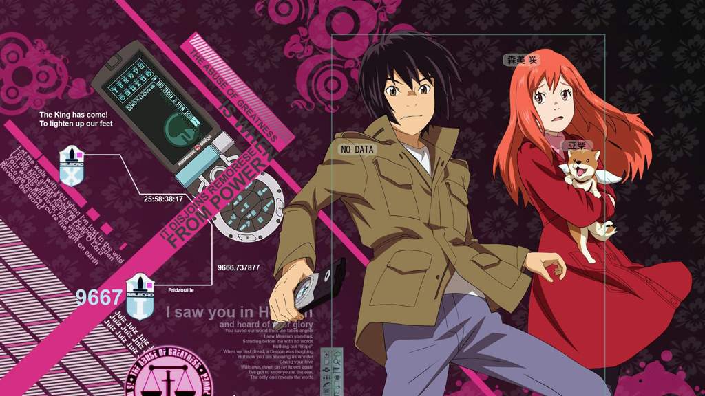 the show was directed by Kenji Kamiyama. he's pretty well known for stuff like ghost in the shell: stand alone complex, moribito, a run of ultraman, 009 RE: cyborg, jin roh and napping princess. he does a great job with the show and you can get the feeling it was very much a passion project. same goes for the animation studio behind it who did a great job. it was animated by production IG, best known for stuff like haikyuu, GITS: stand alone complex, cromartie high school, XXXholic, a personal favourite of mine with the 3 seasons of sengoku basara as well as it's movie, kimi ni todoke, kuroko no basuke, psycho pass and video girl ai. The show is pretty easy to find if you want to watch it. The whole thing is on youtube for free and the DVD's are super cheap and common at least in my region, plus it's only 11 episodes so it's a very breezy watch. there's even a collected version with both movies that's on blu ray and DVD or the individual ones like i have, so your options are wide open. i would avoid the streaming versions though, these cut the oasis opening and don't seem to have the "air communication" movie which is a theatrical retelling of the movie that shortens it a little and ads in some fun commentary from the show's characters on the events. it's a neat bonus that was included on the second disc for king of eden. it's worth a watch but i'd say only as a bonus after you finish the show since it spoils a ton and has the characters speaking over key scenes. still the extra lore was super welcome and i'm always willing to hear more from this cast any chance i could. the two movies are required viewing though. they act as the second half of the show more or less and are still on par with the show, king of eden especially is a great time. the show in general is a great watch, it goes without saying that you should give it a try but if you have any hesitation then at least check out the first episode on youtube. i promise it'll hook you.