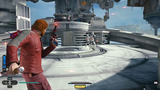 the combat is a step up, at least. while it still suffers from most of the same flaws, now there's just some slight ways to mitigate the game's issues and it overall feels much easier on those easier difficulties and it's still as fun as it was before to throw enemies off of ledges. it gives you the first game's abilities back, same movesets complete with the meter draining special moves, but it also adds 3 more styles to it which does at least add some variety, you have a massive dual handed broadsword style which is too slow for me to get much use out of but it does huge damage. it's good for bosses. there's a dual wield stance as a real thing now with a focus on parries. it's okay but I found the parry focus to make it my least favourite style. you also get the best style that never left my rotation, the gun style. this is a style that combines the sword with a cool blaster gun. you replenish ammo with the word by hitting people and you can shoot from a range which helps to shred shield and health, plus there's even a cool ability where you can charge and aim for massive damage, taking out entire groups in one shot sometime. it's the best the combat system gets. the boss fights are better too. they're easier but also more varied and more fun, same with the optional ones (including a fun set of bounty hunter missions that reminded me a lot of mercenaries for ps2 but a lot less cool) and a particularly cool boss here too which makes great use of the games dashes as you take on huge monsters and ships in a sky battle.