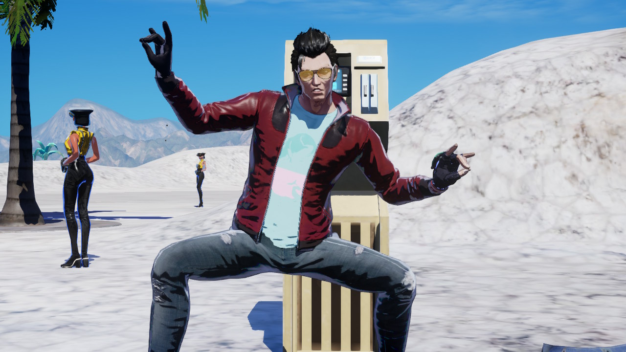 then there is that open world it has. it's not that big but it's pretty varied and full of stuff to find. it's got a strange look to it owing from the fact it's a game of this scale trying to run on the switch of all things and it makes the open world a slightly spooky and uncanny place to explore. it gives the game a really interesting atmosphere and it made me excited to explore around every time i turned the game on. it reminded me of something like the 25th ward or silver case, how creepy and empty those games can be. it's like that but fully explorable and i love that energy, i have to imagine this is intentional since the "perfect world" area of the map is at least partially based on some of the stuff shown off in 25th ward. the other area's of the map are cool too. you have most of santa destroy, bar a small section that was destroyed at the games beginning. not all of it is explorable though, which is an issue most of the map has with large areas just blocked off with no way to know what would otherwise be there despite them being shown on the map. so much of it is blocked off for seemingly no reason, I'm sure there is a reason but it does still bug me a little. there's also a call of duty inspired warzone with some cool destroyed buildings and a really nice looking beach, a huge salt flats wasteland, a cute little Osaka inspired Japanese zone and a fairly empty futuristic island. all interesting areas to explore, though they do tend to get a little less cool as the game goes on. there are some neat minigames to do there though, tons of collectables to find too! the main minigames i liked were probably the bike stages that have you take down rival cars, the spelunker inspired mining levels and the famicom style sidegame "deathman" which is fully featured and so cool to see. there's other stuff too though, like defence missions which are where most of the games combat comes in, collecting garbage in top down segments, turret segments and a really fun lawnmower minigame. nothing quite as fun as some of the ones in 2 for me but it's still a very solid set of minigames.